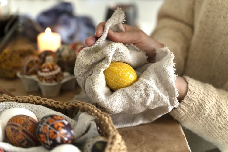 Когда яйца приобрели нужный оттенок, их следует аккуратно достать ложкой и выложить на бумажное полотенце. Скорлупа должна высохнуть естественным путем, тереть ее не нужно, чтобы не повредить слой краски. Для придания красивого глянцевого блеска полностью сухие яйца слегка натирают ватным диском, на который капнули немного обычного подсолнечного масла.