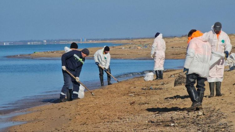 На побережье Анапа продолжаются работы по ликвидации последствий загрязнения: спасатели дежурят у моря, а волонтёры собирают птиц, покрытых мазутом.